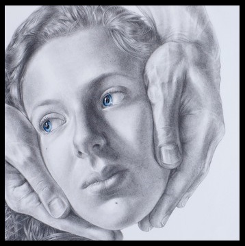 This portrait of the Delphic Oracle in a state of trance explores the duality of masculinity and femininity by incorporating aspects of Jungian psychoanalysis and Greek myth. The Oracle’s animus (masculine inner personality) has taken the archetypal form of the God Apollo whose hands encircle her face and is expressed via the prophecies she delivers. Her blue eyes symbolise absence of the conscious elements of her psyche, as, biologically, blue eye color arises from lack of pigment.