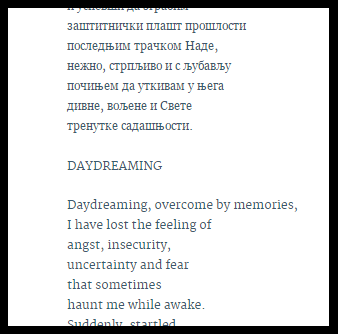 This poem, “Zanesena u sećanjima / Занесена у сећањима” (“Daydreaming”) was written in Serbian, Vesna’s mother tongue. See the poem in both Serbian scripts (Latin and Cyrillic), as well as an English translation (kindly provided by Vesna herself), below.