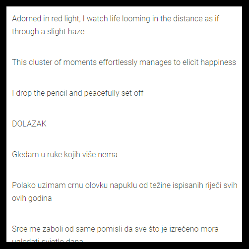 This poem was originally written in Croatian, Saša’s mother tongue, and is provided in its original form, as well as with an English translation (kindly provided by Dunja Kaczmarek and Saša), below.
