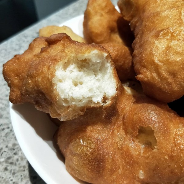 Get a 20cm wide pot and pour oil into it to a depth of about 2cm. Heat it gently on a medium-hot stove. Meanwhile, get the dough and spread it with your palms and fingers until it is about 3cm thick. Get a large spoon (like a serving spoon), dip it into some extra oil and use it to roughly carve off pieces of the dough. Gently spread each piece with your fingers so it is of roughly equal thickness all around, then gently place it into the hot oil. Keep good control of the heat under the pot – it should not be so hot as to burn the mekike, but it should not be lukewarm either. The mekike will be done when they are a light-to-medium brown colour and attain a slight crunchy edge (like donuts).