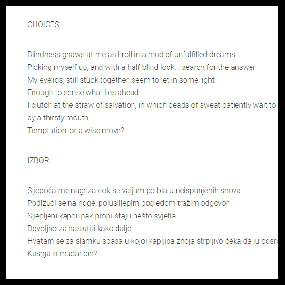 This poem was originally written in Croatian, Saša’s mother tongue, and is provided in its original form, as well as with an English translation (kindly provided by Dunja Kaczmarek and Saša), below.