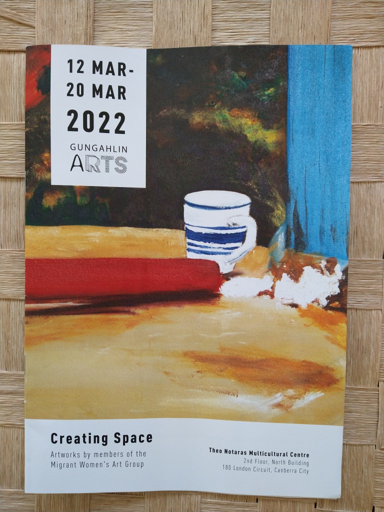 ‘Creating Space’ is an exhibition that has been put together by the women of the Migrant Women’s Art Group (MWAG), which meets in Gungahlin, in the north of Canberra. Kirandeep Grewal (of kiranDesignstudio) and Michele Grimston (of the Belconnen Arts Centre) launched the MWAG together in 2019, and ever since – yes, even through COVID, whenever and however safe to do so – the group has seen Kiran and others lead weekly art workshops for migrant women in the Gungahlin region. In these workshops, both budding artists and those with many years of arts practice under their belts come together to share their stories and experiences of creating art and craft across their different homes. ‘Creating Space’ is the MWAG’s first exhibition, and was launched on Friday 11 March 2022. It will be on display at the Theo Notaras Multicultural Centre until Sunday 20 March 2022.