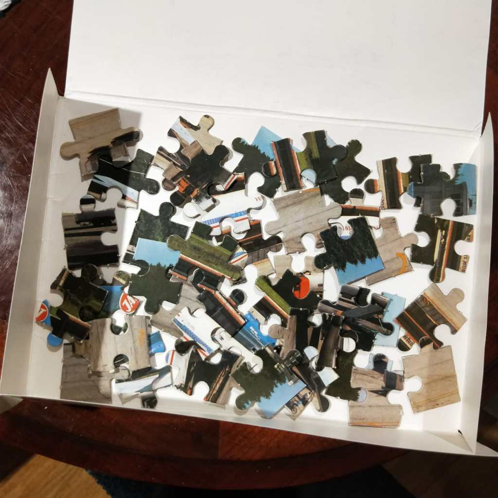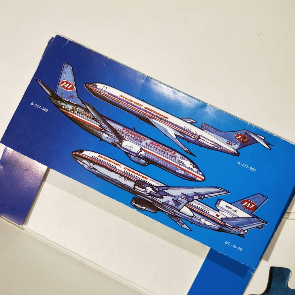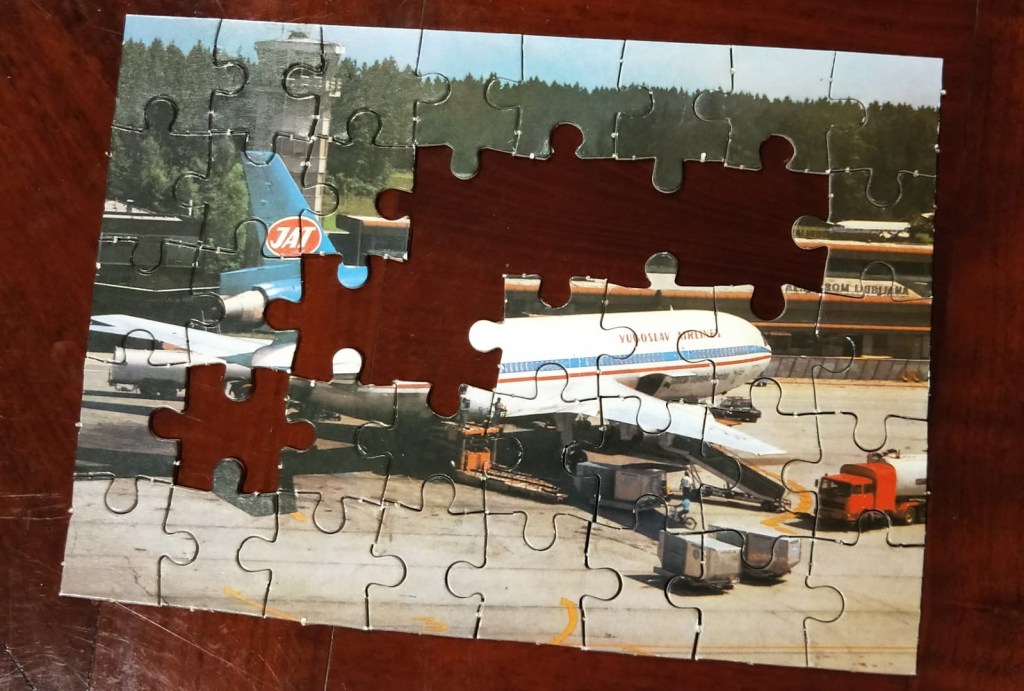 Next, I take the puzzle into my hands. The pieces are all there – all 40 of them – and I see snippets of trees, plane windows, runway concrete and the letters “JAT” on the different pieces.