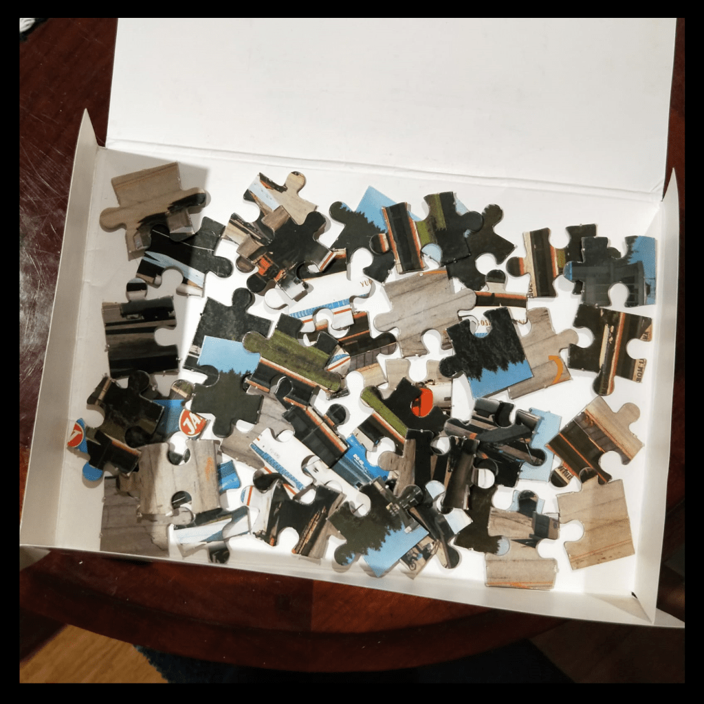 Without thinking, my hands start picking the pieces up, instinctively finding the edges and corners and starting to construct the frame. And then I’m filling the puzzle in, piece by piece.