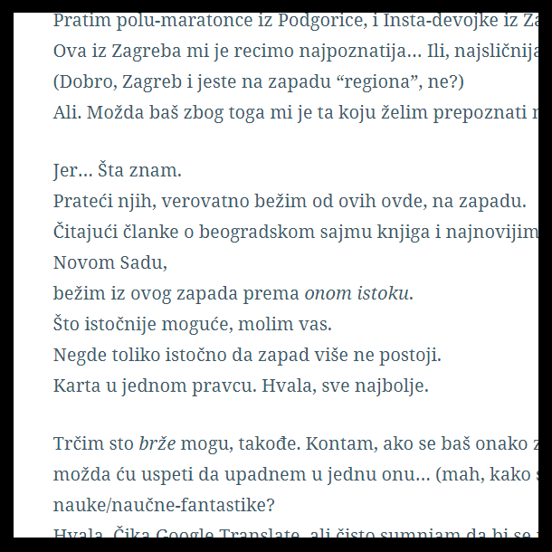 PROSE POEM: Dunja Cvjetićanin takes us through a stream-of-consciousness exploration of her efforts to connect to contemporary life in the Balkans, from a distance.